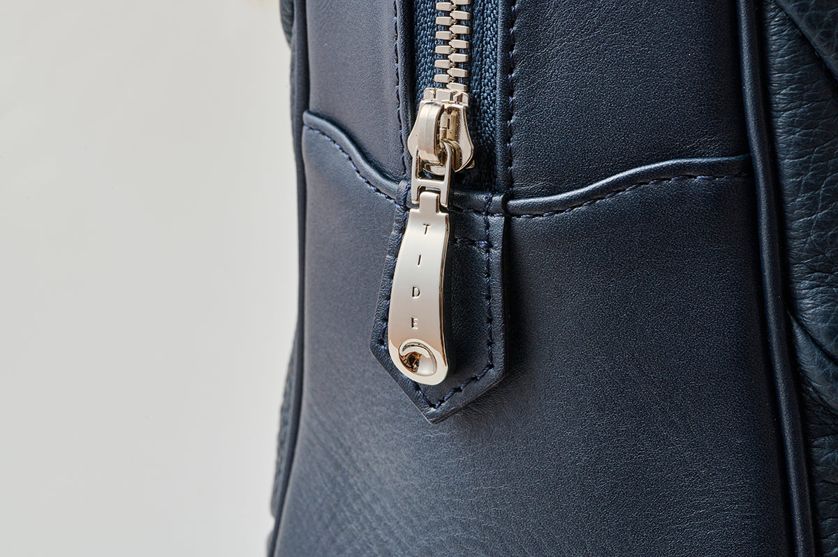 中でも、製品に使用されている引手(スライダー金具)は型からおこし、ブランドの刻印を入れたオリジナル。